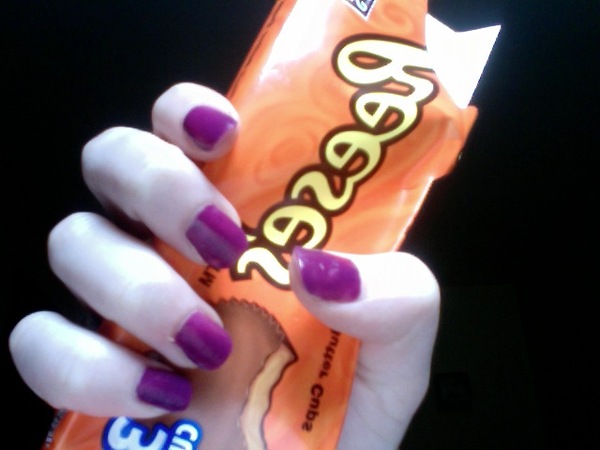 The woman taking my acrylics off left my nails in the solution for far too long and then failed to take all of it off. This meant that my own nails were deprived of oxygen and had turned a nasty shade of purple/blue. She then filed my own nails down further than I asked and also ruined my cuticles, making my cuticles bleed badly – which have now scabbed over, attractive D: